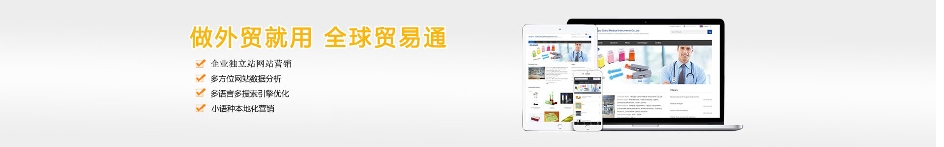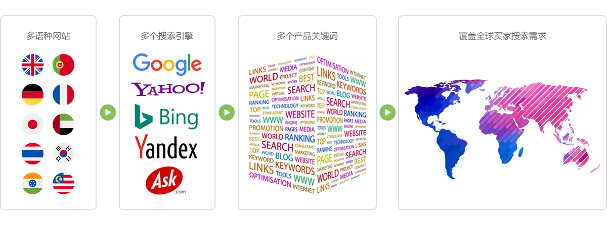 根據(jù)您的目標市場選擇合適的全球貿(mào)易通網(wǎng)站語種,我們?yōu)槊恳粋€英文關(guān)鍵詞擴展為多個不同語言的關(guān)鍵詞,同時面向多個搜索引擎進行推廣營銷,力求占領(lǐng)用戶在全球各個國家的搜索排名。